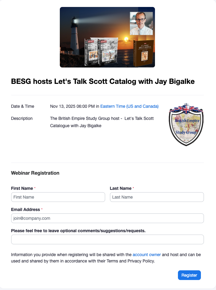 -The British Empire Study Group (BESG) is having a zoom call to discuss the future of the Scott Catalog. The web page to register to get the zoom link is here.
